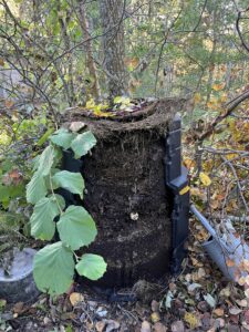 2. klipper ned plantan men sparar rotsystemet i jorden. Här kring rötterna trivs mängder med mikroorganismer och maskar. De vill vi inte störa, och de kommer bryta ner rotsystemet åt oss under vintern.